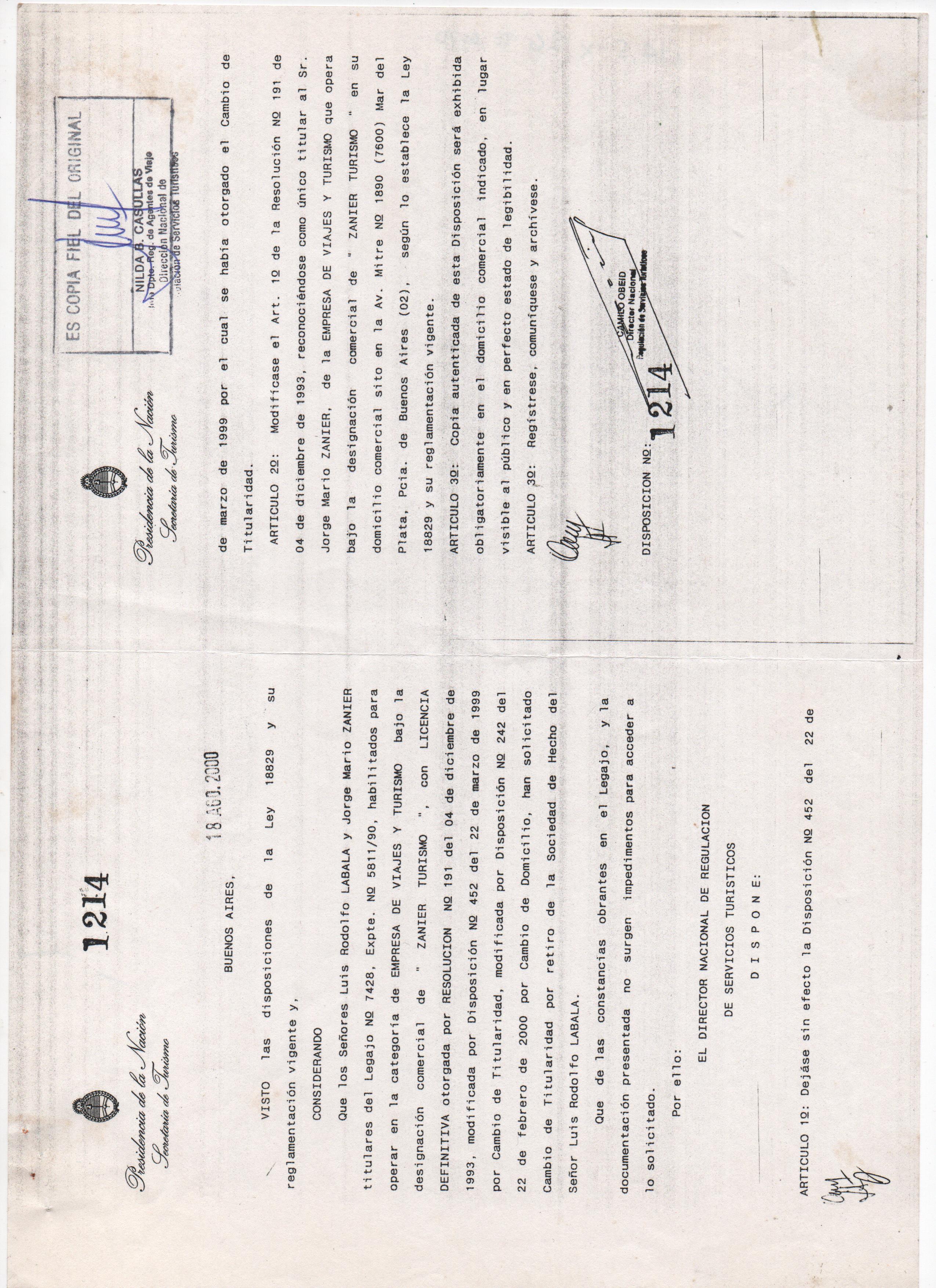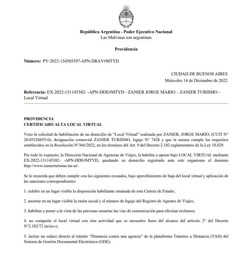 "ZANIER TURISMO" - RAZON SOCIAL : Jorge Mario Zanier - CUIT: 20-05326655-0